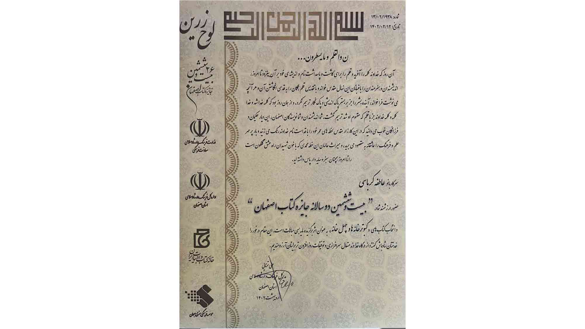 در رویداد «بیست و ششمین دوسالانه جایزه کتاب اصفهان» که در اردیبهشت ماه 1402 برگزار شد، کتاب های «کبوترخانه ها، با نگاهی به برج های آق غلامعلی نجف آباد» و «چهل خانه: كالبد و زندگى در چهل خانه ی تاريخى نجف آباد» تالیف خانم دكتر عاطفه كرباسى، عضو هيأت علمى دانشكدۀ معمارى و شهرسازى، به عنوان آثار برگزیده معرفی شد.