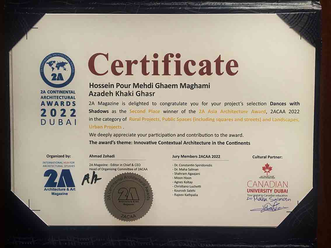 «رقصنده با سایه‌ها» طراحی شده توسط دو تن از اعضای هیات‌علمی گروه معماری، دکتر حسین پورمهدی قائم‌ مقامی و دکتر آزاده خاکی‌قصر، موفق به دریافت رتبه دوم در بخش فضاهای عمومی از جایزه معماری 2A شد. همچنین در نشست‌های کارگاهی - آموزشی که به گفتگو و بحث درباره همراهی "محلی و جهانی"(Global+Local) در معماری می پرداخت و در جریان برگزاری جایزه 2A از سوی دانشگاه کانادایی دوبی روی داد، خانم دکتر خاکی قصر به سخنرانی با عنوان "تاملی در تمرینات طراحی-ساخت" در یکی از پنل های گفتگوی برنامه مذکور پرداختند.