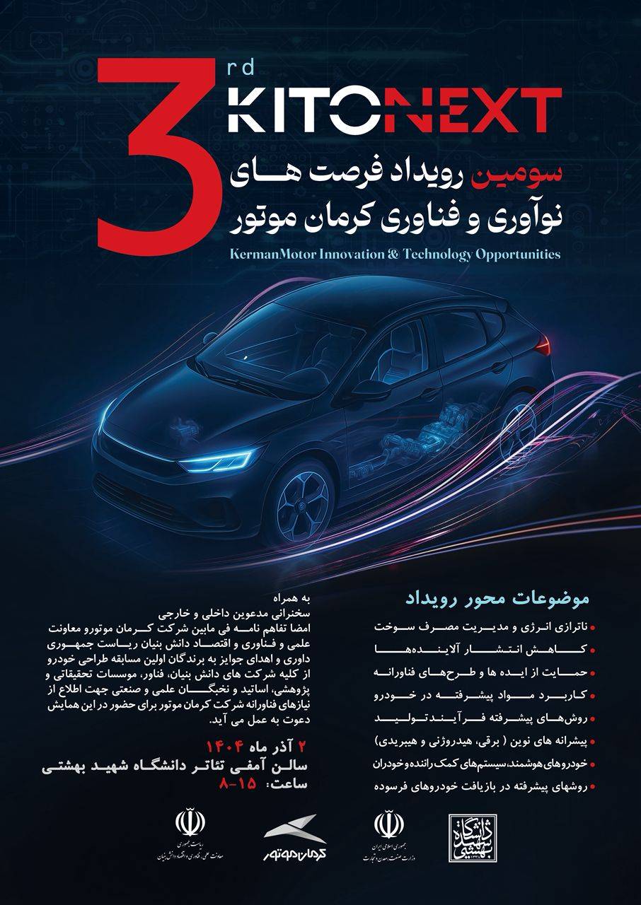 سومین دوره رویداد فرصتهای نوآوری و فناوری کرمان موتور با عنوان KITONEXT، روز دوم آذر 1404 در دانشگاه شهید بهشتی برگزار می‌شود و هدف آن توسعه همکاری های صنعت و دانشگاه و شناسایی و حمایت از ایده‌های نو در حوزه فناوری و صنایع خودروسازی است.