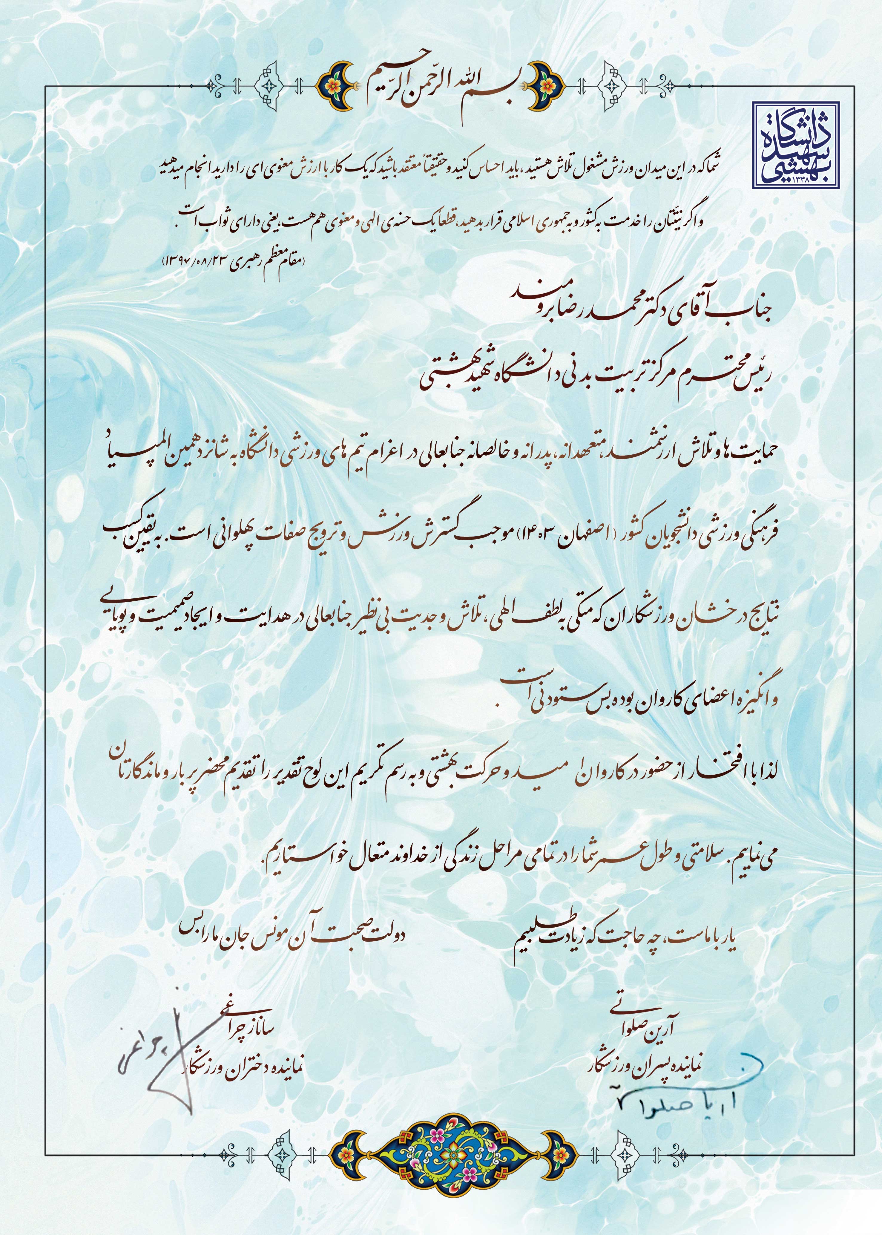 لذا با افتخار از حضور در کاروان امید و حرکت بهشتی و به رسم تکریم این لوح تقدیر را تقدیم محضر پر بار و ماندگارتان می‌نماییم.